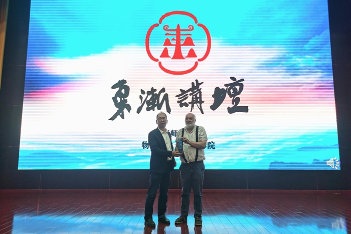 近日,物理与电子科学学院第19期“东渐讲坛”第36讲在长清湖校区树蕙堂报告厅举行。本次“东渐讲坛”特别邀请英国皇家工程院院士Somekh Michael Geoffrey教授作报告。副校长、物电学院院长蔡阳健出席活动并向嘉宾颁发“东渐讲坛”奖杯。欧洲科学院院士、教育部长江学者特聘教授、深圳大学讲席教授袁小聪,之江实验室冯甫教授受邀出席,物理与电子科学学院领导、相关专业教师、研究生和本科生300余人参加活动。长江学者讲席特聘教授Taco Dirk Visser主持报告会。
