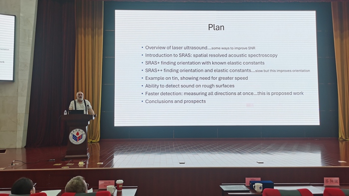 Somekh Michael Geoffrey作题为《Quantitative Laser Ultrasonics》(《后期定量超声学》)的学术报告。他概述了激光超声波在颗粒和材料纹理成像研究领域的应用原理,阐明了激光超声波的优缺点,并进一步介绍了该领域的最新研究成果。基于测量材料的晶粒取向和弹性性质的可能性,Somekh Michael Geoffrey给出其纹理和成分信息,并讨论了电子背散射衍射技术的应用前景。报告结束后,Somekh Michael Geoffrey教授与部分现场师生进行了交流互动,对师生提出的问题进行了耐心详细的解答,深化了此次学术交流的广度与深度。报告受到师生热烈欢迎。