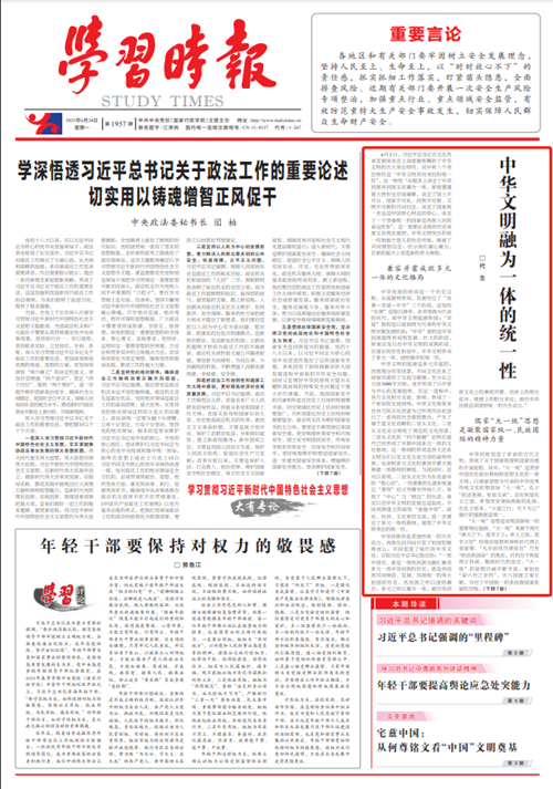 6月26日,《学习时报》A1版刊发我校代生副教授文章《中华文明融为一体的统一性》,原文如下: