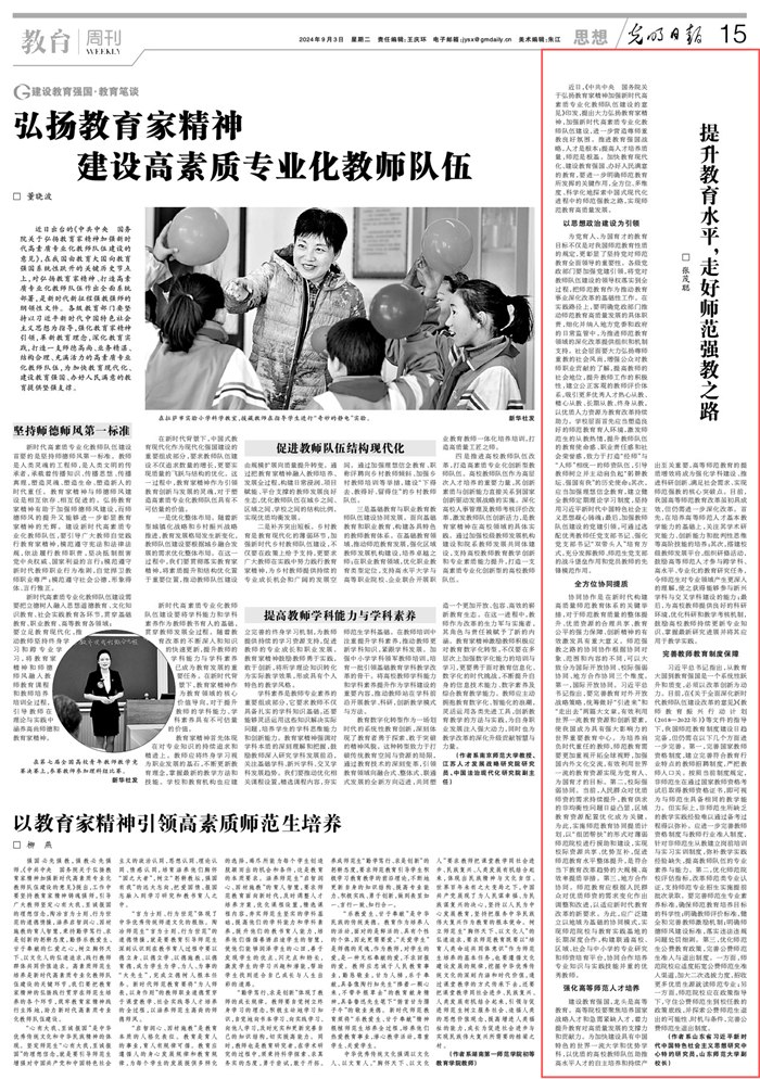 2024年9月3日,《光明日报》15版刊发山东省习近平新时代中国特色社会主义思想研究中心特约研究员、山东师范大学副校长张茂聪理论文章《提升教育水平,走好师范强教之路》,全文如下: