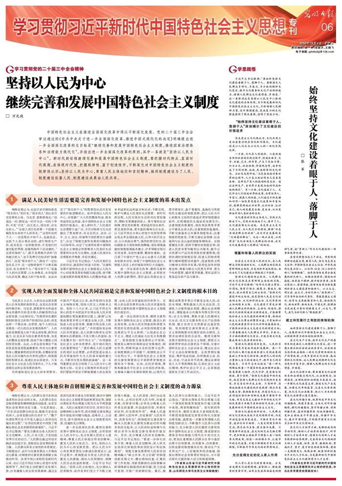 12月4日,《光明日报》“学习贯彻党的二十届三中全会精神”专栏刊发我校党委副书记万光侠理论文章《坚持以人民为中心 继续完善和发展中国特色社会主义制度》,全文如下: