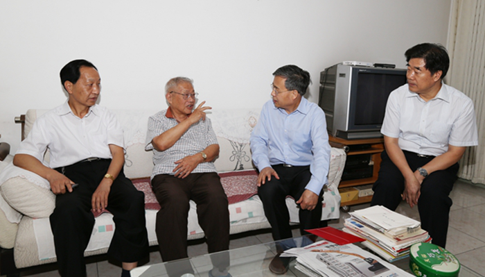 2013年教师节,时任山东省委副书记、省长郭树清(右二)来到姚敦义先生(左二)家中看望