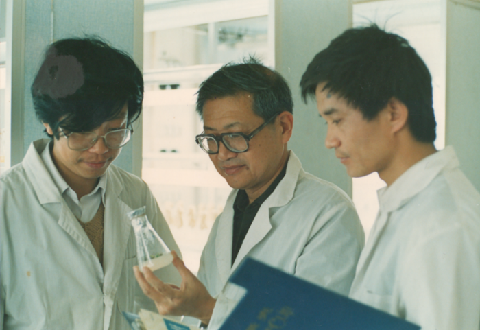1989年秋,姚敦义教授(中)在指导研究生牛其文(左)和董春海(右)
